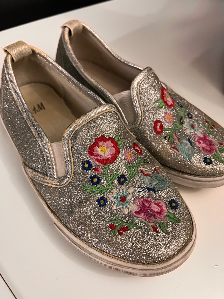 Kız çocukları için gri simli tekstil üstü ve renkli çiçek nakışlı babetler, bohem tarzı yansıtır. Rahat ve retro, hippie havası taşır. #h&mbabet #kızçocukbabet #parlakayakkabı #çiçekliayakkabı