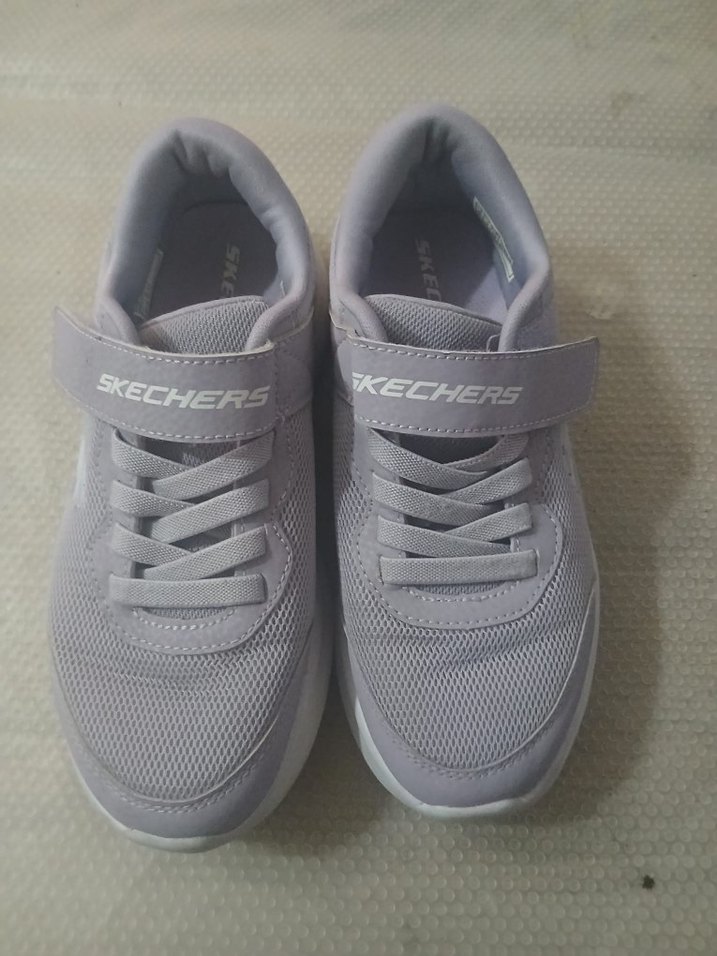 Gri renkli Skechers kız çocuk spor ayakkabısı, kolay kullanım için Velcro bantlı ve kauçuk tabanlıdır. Düz ve desensiz tasarıma sahiptir.