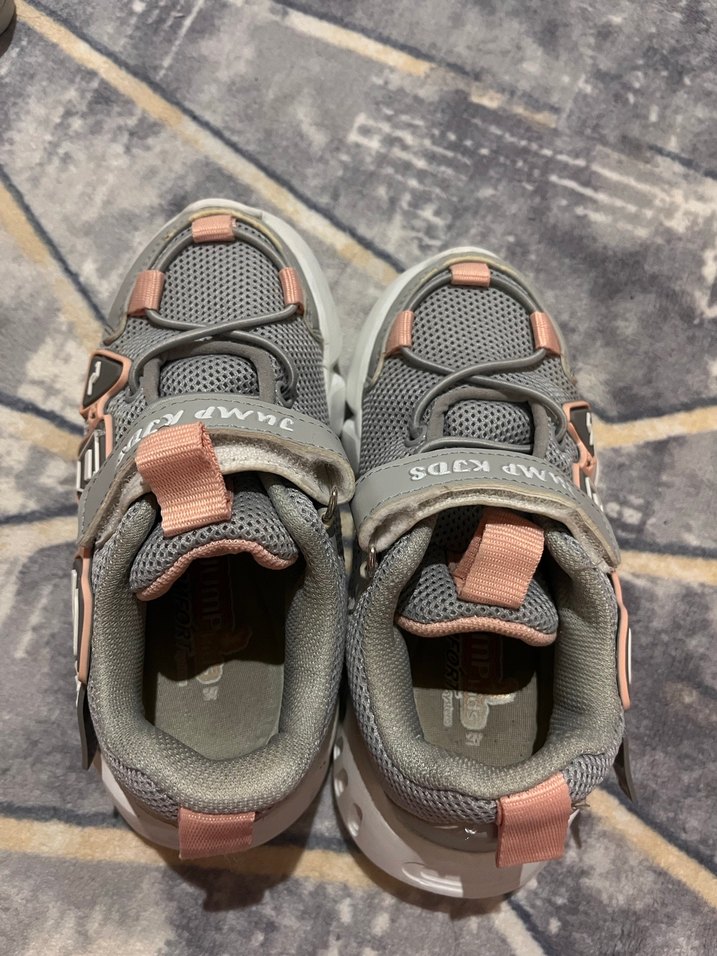 Gri kauçuk tabanlı kız çocuk spor ayakkabısı, trend sokak stili için uygundur.
