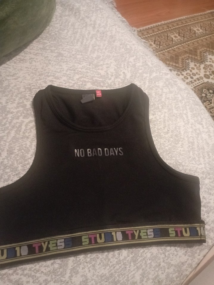 Kız çocukları için straplez, kemerli ve baskılı "NO BAD DAYS" yazılı gri crop top. Sentetik kumaştan, sokak stili ve rock punk havası taşır.