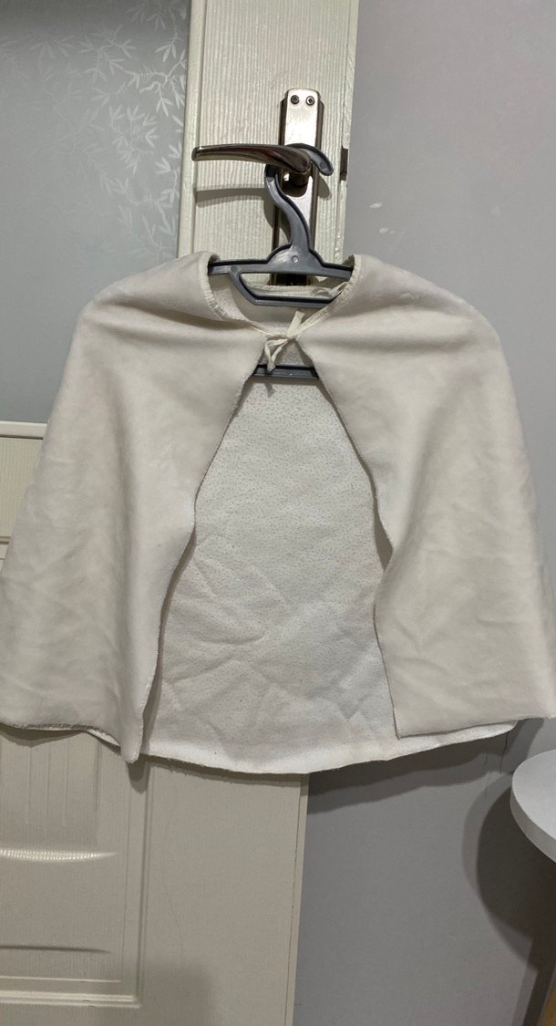 Drapeli, yaka detaylı kız çocuk pelerin, yumuşak süet kumaştan, gri renkte ve salaş kesimlidir.