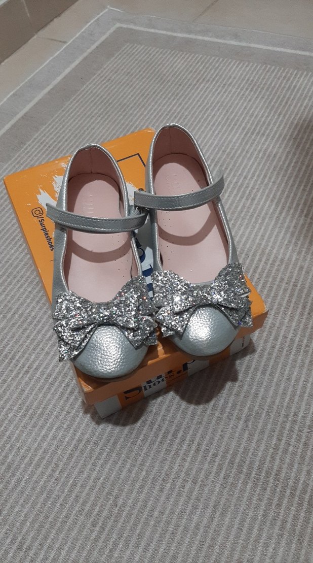 Gri renkte, tokalı kayışlı ve parıltılı fiyonk detaylı kız çocuk babet ayakkabı. Rahat kullanım için kauçuk tabanlı. ✨