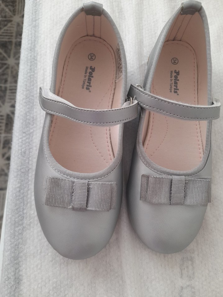 Kız çocukları için tokalı, gri renkte kauçuk babet ayakkabı. Modern klasik tarzda, düz ve fiyonk detaylıdır. Polaris markası.