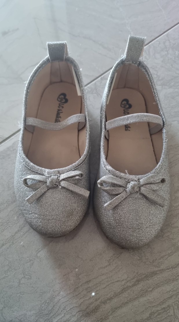 Kız çocukları için lastikli, fiyonk detaylı gri simli babet