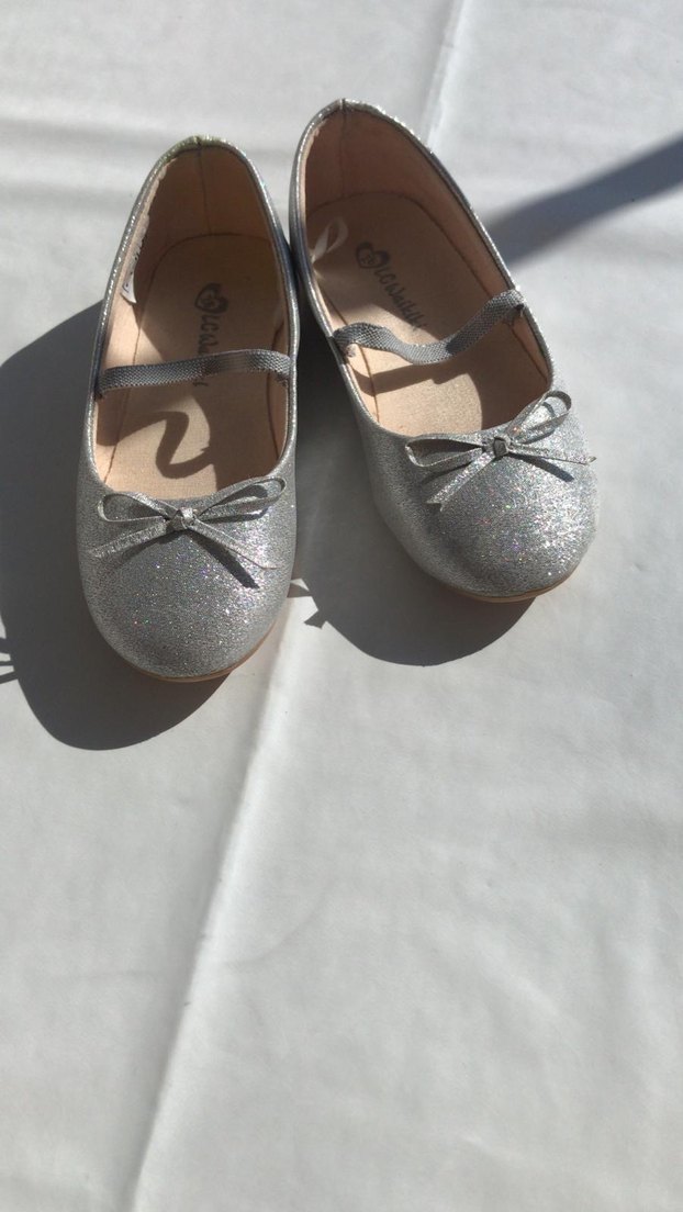 Gri renkte, tokalı ve fiyonk detaylı kız çocuk bale ayakkabısı. Kauçuk malzemeden, çağdaş tarzda.