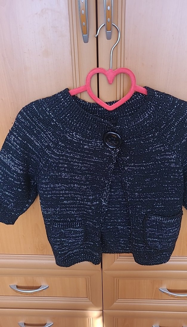 Bu kız çocuk triko bolero, fitted kesim, yuvarlak yaka ve kisa kolludur. Yumuşak örgü kumaştan yapılmış siyah renkte, düğme ve küçük ceplere sahiptir.