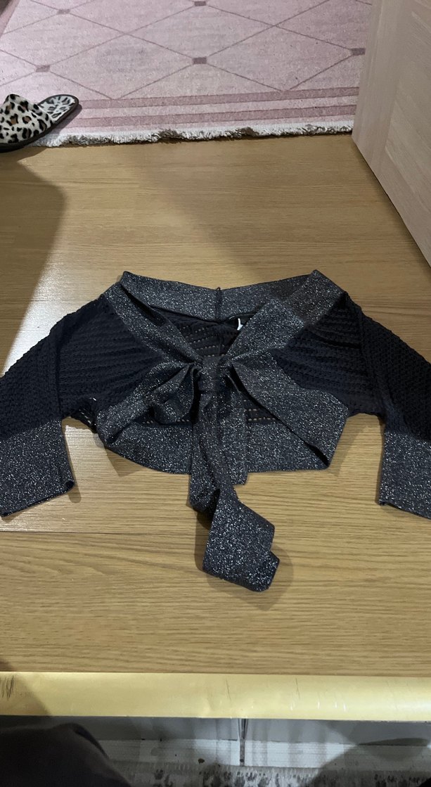 Kız çocuklar için uzun kollu, tek renk gri triko bolero, bot yaka ve hafif ışıltılı goth tarzıyla dikkat çekiyor. ✨