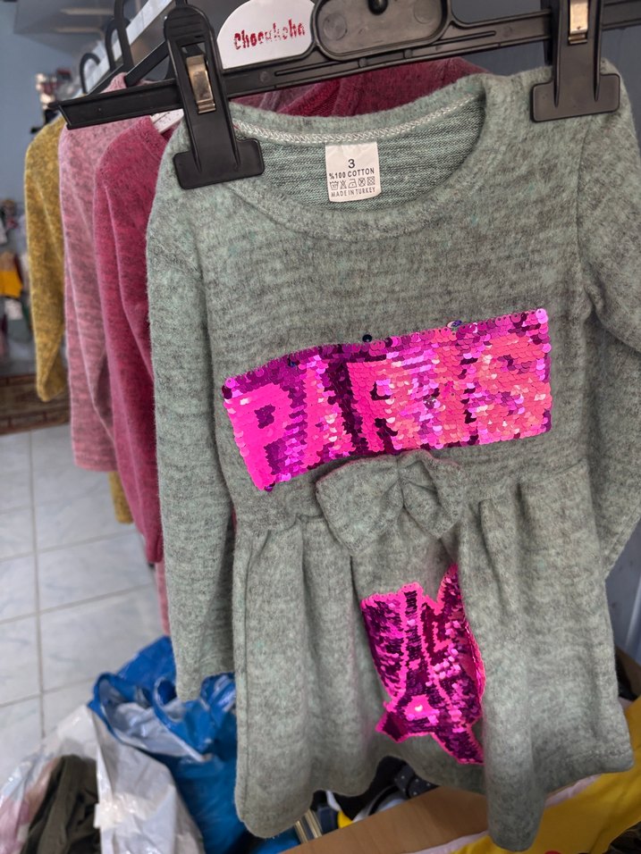 Yumuşak fleece kumaştan yapılmış, uzun kollu, vücuda oturan gri triko elbise, canlı pembe payetli baskılarla süslenmiştir.