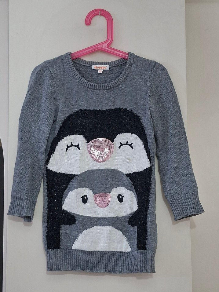 Gri renkli, triko kumaştan, bisiklet yakalı ve uzun kollu, ön kısmında anne ve yavru penguen baskısı bulunan kız çocuk kazak. Payet ve sim detaylı. Tunik boy.