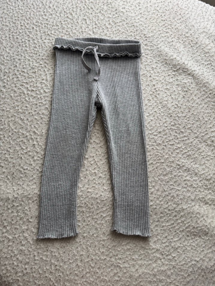 Yumuşak triko kumaştan yapılmış, kız çocukları için fitted gri triko tayt. Düz ve desensiz, bağcıklı bel ile rahat ve temel bir stil sunar. Az kullanıldı çok esnek değildir güzel sarıyor bacağı
