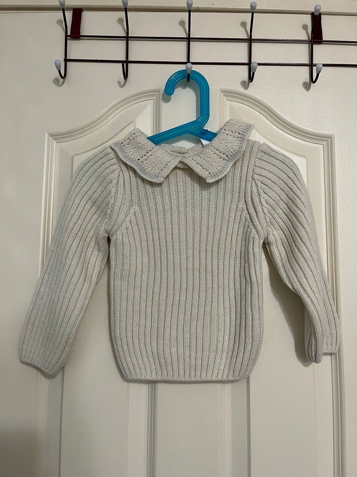 Fitted kesimde, uzun kollu, gri renkte, yakalı ve örme dokuda kız çocuk kazağıdır.