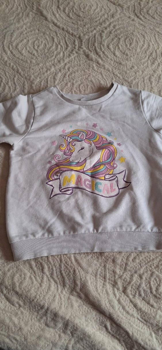 beyaz renkli kız çocuk sweatshirt, yuvarlak yaka ve uzun kolludur. Rahat kesimli, yumuşak pamuklu kumaştan yapılmış ve renkli unicorn baskısı "Magical" yazısı ile dikkat çeker.