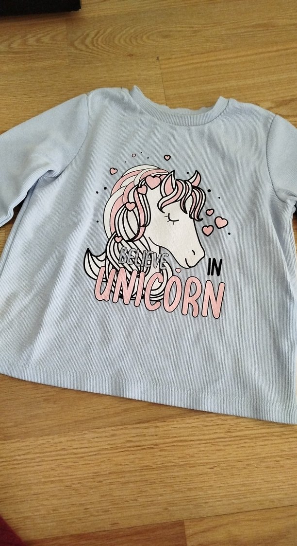 Pamuklu, mavi renkli, uzun kollu ve yuvarlak yakalı kız çocuk tişörtü. Üzerinde "Believe in Unicorn" yazılı unicorn baskısı ve düğme detayları bulunur.