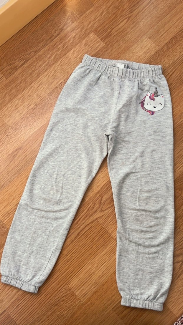 Gri, bol kesim kız çocuk eşofman altı, elastik bel ve unicorn nakışı ile. Yumuşak, sıcak kumaştan üretilmiştir, günlük sokak stili için uygundur.