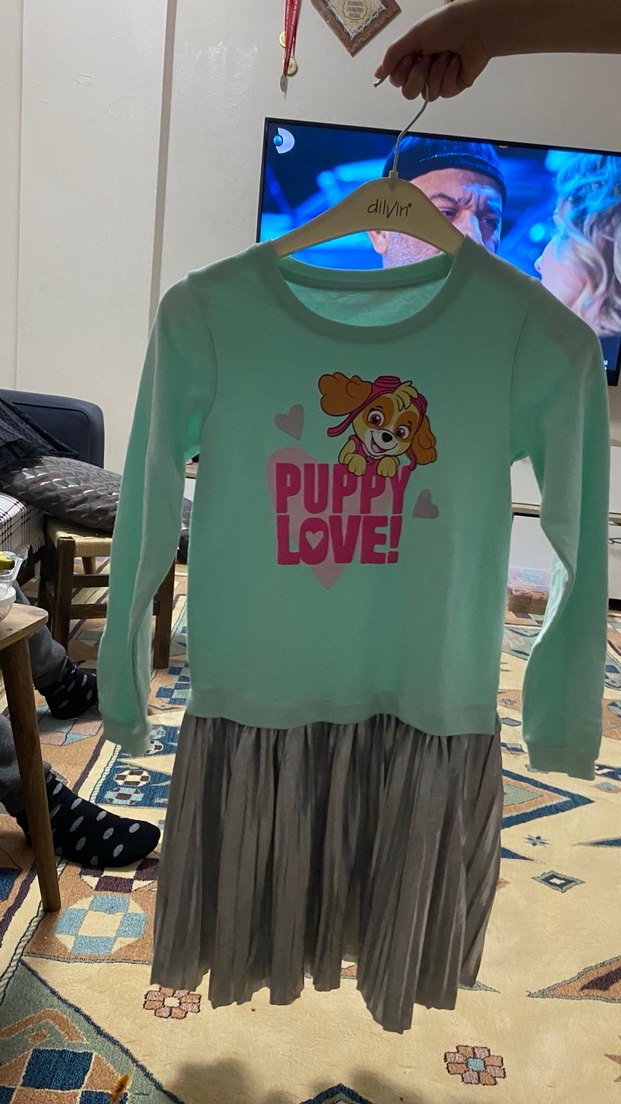 Bu gri elbise uzun kollu, bisiklet yaka ve bol kesimdir. Üst kısmında baskılı köpek deseni ve pileli etek bulunur, yumuşak ve sıcak kumaştan üretilmiştir.