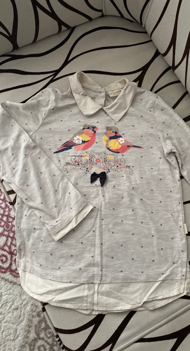 Gri renkli, küçük nokta desenli, uzun kollu, düğmeli ve yakalı, iki renkli kuş baskılı kız çocuk gömleği. Rahat kesim, trend sokak stili için uygun.