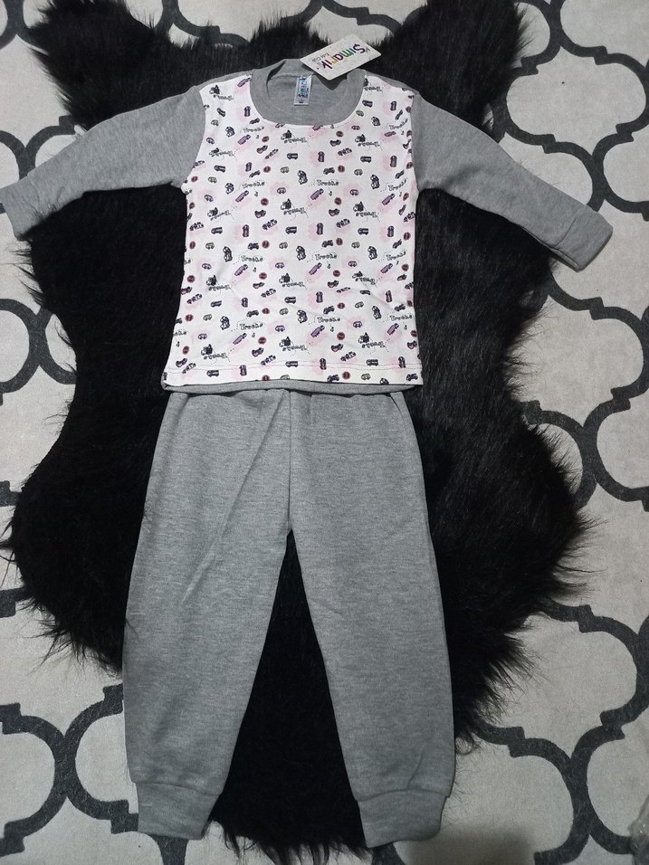 Kız çocukları için uzun kollu, bisiklet yakalı ve baskılı üst kısmı yumuşak örme dokulu pijama takımı. Alt kısmı sade gri ve rahat kesimlidir. ️