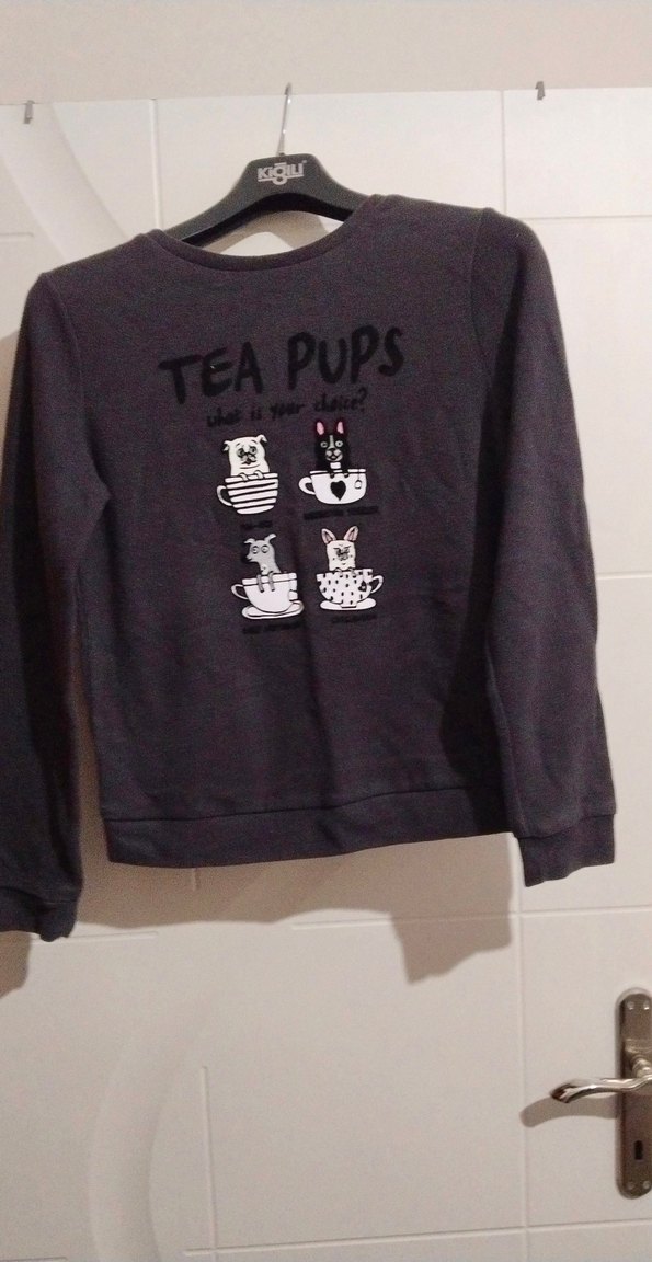 Kız çocukları için gri uzun kollu, bisiklet yaka ve bol kesim sweatshirt. Örme dokusu ve 'TEA PUPS' yazılı, fincan içindeki köpek baskısı bulunur. Yumuşak ve sıcak kumaştan üretilmiştir. ☕