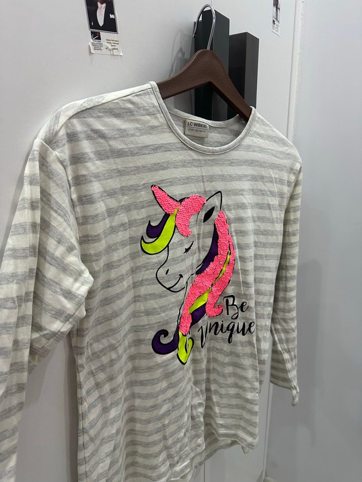 Gri çizgili, uzun kollu ve bisiklet yaka kız çocuk sweatshirtü. Sentetik, örme kumaştan, bol kesim ve renkli unicorn baskılıdır. Streetwear tarzına uygundur.