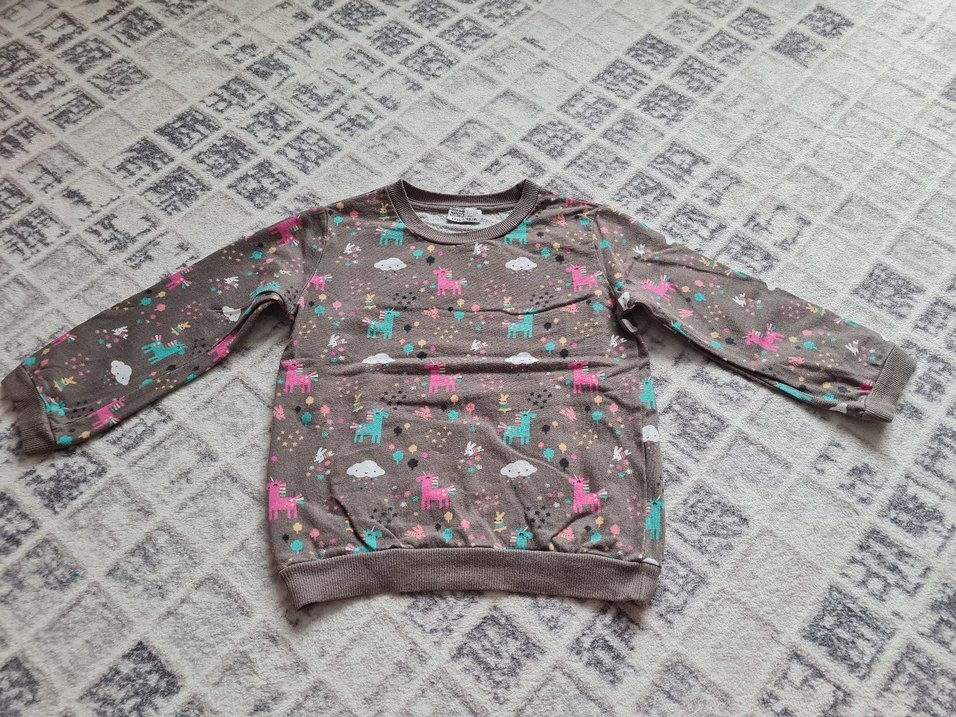 Kız çocukları için uzun kollu, bisiklet yakalı, yumuşak fleece kumaştan yapılmış, bol kesim ve örme dokulu gri sweatshirt, renkli baskılı desenlidir.