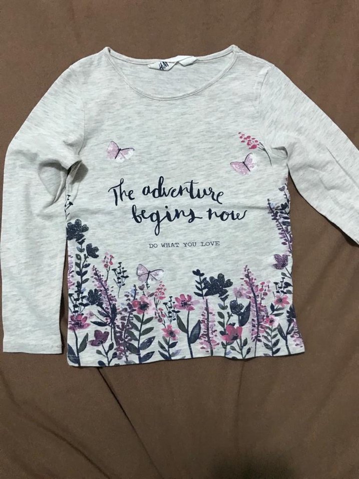 Gri renkli, uzun kollu kız çocuk tişörtü, bol kesim ve baskılı çiçek ile kelebek desenlerine sahip. Düğme detaylı, bisiklet yaka, bohem tarzda. Üzerinde 'The adventure begins now. Do what you love.' yazısı bulunur.