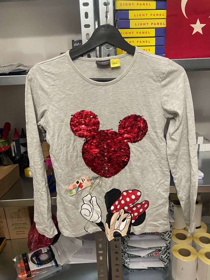 Gri renkli, uzun kollu kız çocuk tişörtü, bol kesim ve düğme detaylıdır. Bisiklet yaka ve kırmızı pul işlemeli popüler çizgi film figürü baskısı vardır. Sentetik kumaştan, trend sokak tarzına uygun.