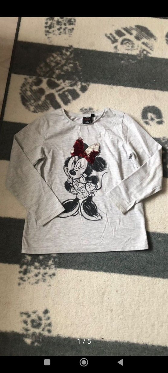 Gri renkli, uzun kollu, örme pamuk kumaştan yapılmış, Minnie Mouse baskılı, salaş kesim ve yuvarlak yakalı kız çocuk tişörtü.