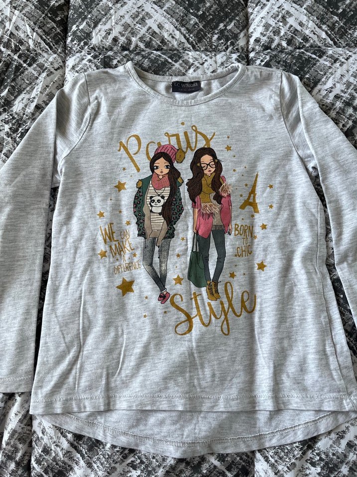 Gri renk, uzun kollu, bol kesim, yuvarlak yaka kız çocuk tişörtü. Yumuşak örme pamuktan yapılmış, baskılı sokak stili tasarımıyla dikkat çekiyor.