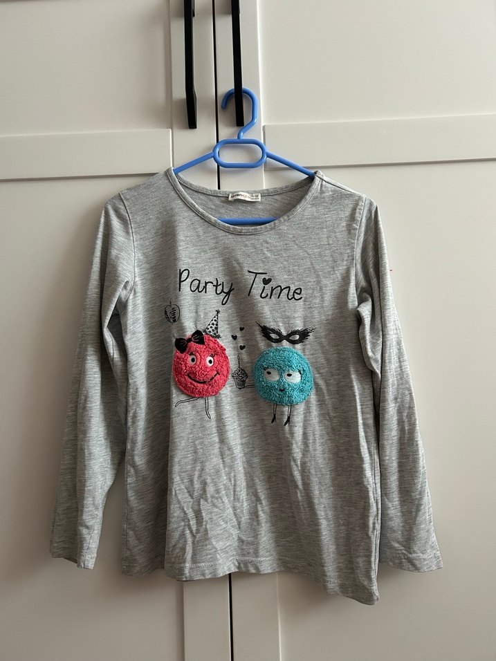 Gri renkli, uzun kollu, düğmeli ve bol kesim kız çocuk tişörtü. Yuvarlak yaka ve dokulu baskı detaylarına sahip, günlük kullanıma uygun.