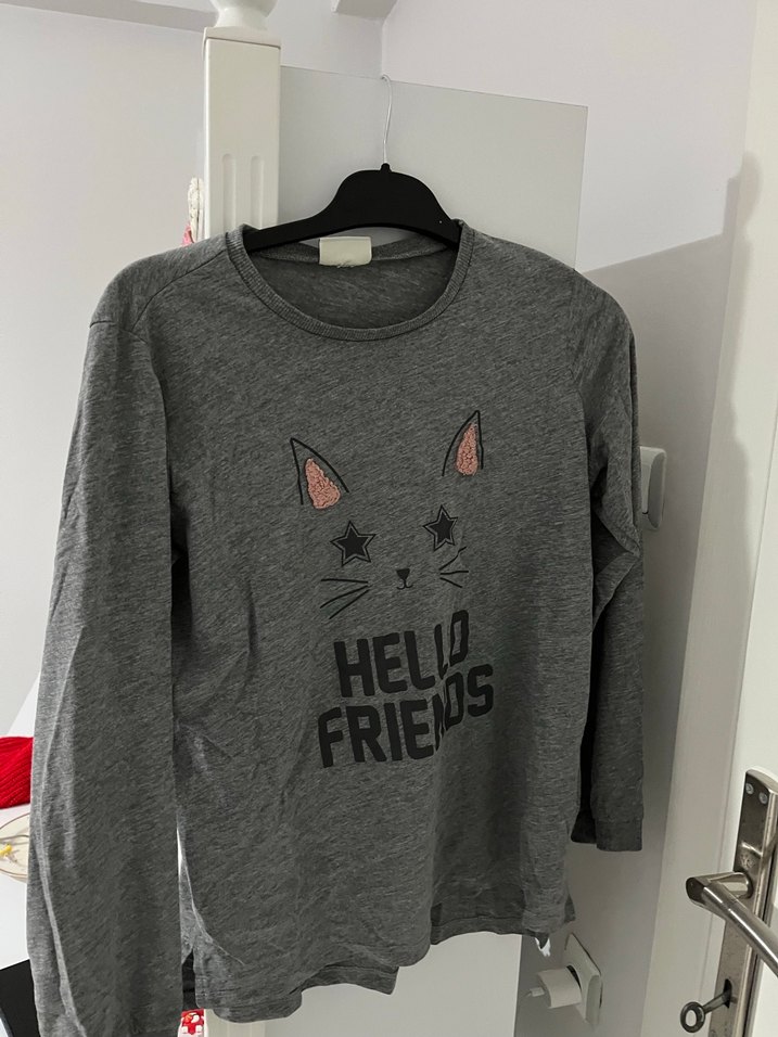 Pamuklu örgü kumaştan yapılmış, uzun kollu ve bisiklet yaka kız çocuk tişörtü. Gri renkte, baskılı kedi yüzü ve 'HELLO FRIENDS' yazısı bulunur.