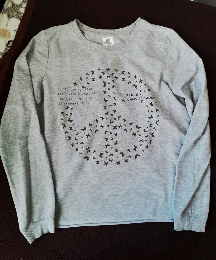 Kız çocukları için gri renkte, uzun kollu, pamuklu kumaştan yapılmış, küçük kuşlardan oluşan barış işareti baskılı, rahat kesim ve bisiklet yaka tişört. ️