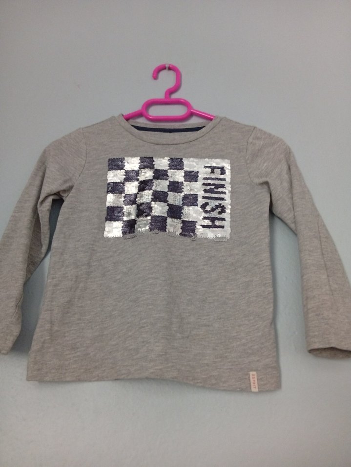 Gri renk, uzun kollu, rahat kesim kız çocuk tişörtü. Örme dokuda, baskılı kareli desen ve "FINISH" yazısı bulunur. Trend sokak stili için uygun.