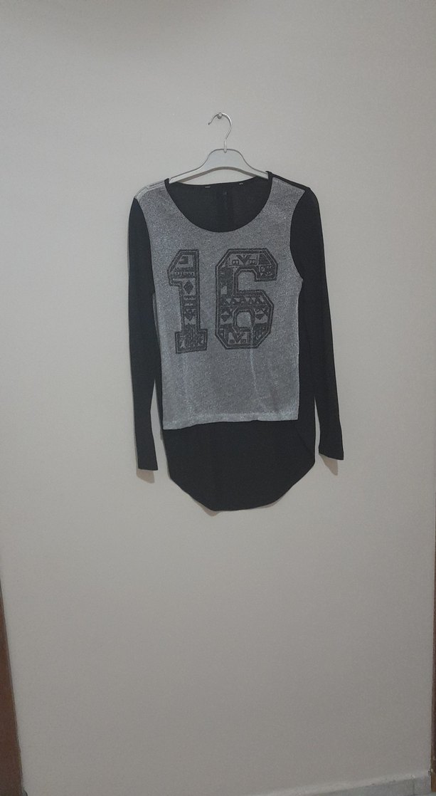 Kız çocuk için uzun kollu, yuvarlak yakalı, bol kesim gri-siyah triko tişört. Önde baskılı 16 sayısı bulunur, sokak tarzına uygundur.
