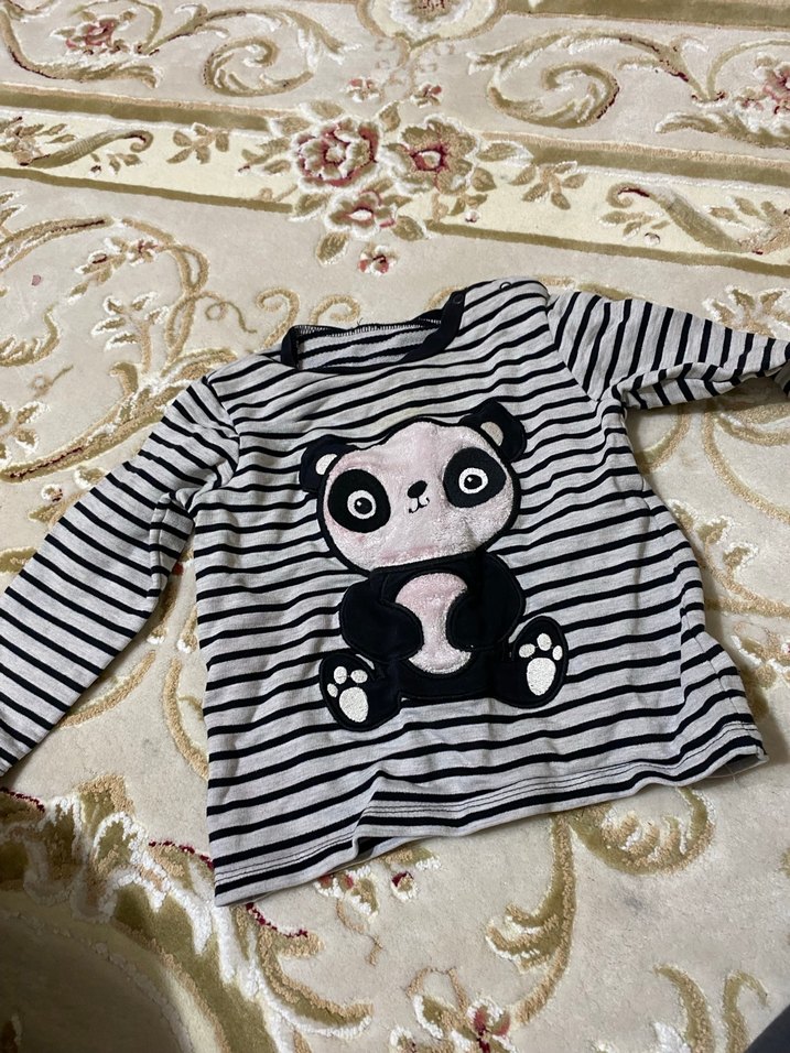 Gri uzun kollu, örgü kumaştan yapılmış, bol kesim kız çocuk tişörtü. Önde çizgili desende ve sevimli panda baskısı bulunur. Bisiklet yaka tasarımıyla sokak stiline uygundur.