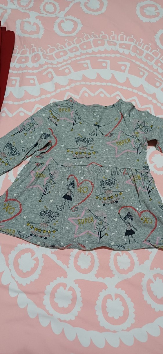 Gri renkli kız çocuk elbisesi, uzun kollu ve V yakalıdır. Pamuklu, örme dokulu ve desenli tasarımıyla rahat bir kesime sahiptir.