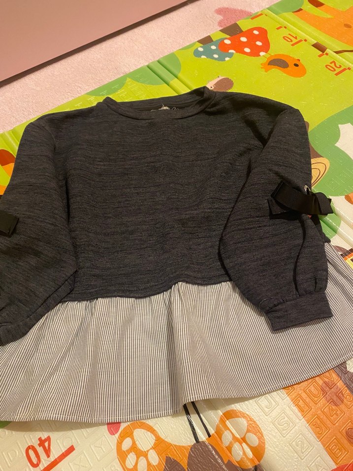 Kız çocuk için uzun kollu, bol kesim ve yuvarlak yaka gri sentetik kumaştan kazak. Etek kısmında fırfır detayı bulunur.