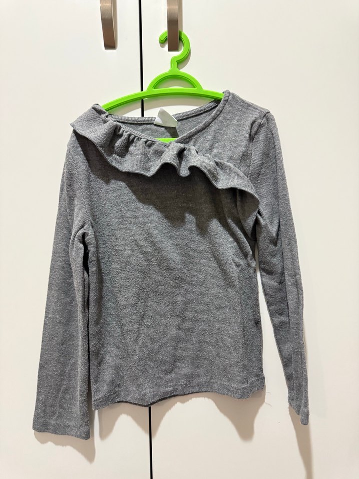 Kız çocuk gri renkli, uzun kollu, yuvarlak yaka, tek yanda fırfır detaylı, bol kesim, yumuşak ve sıcak kumaştan yapılmış sade sweatshirt.