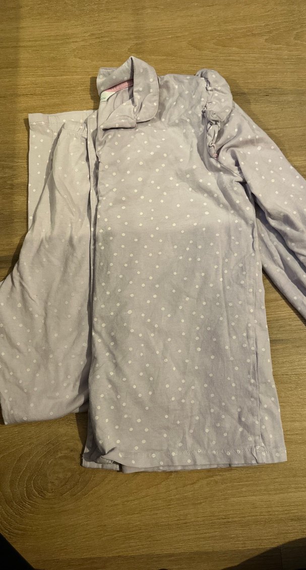 Yumuşak keten kumaştan yapılmış, düğmeli ve kesik yakalı gri uzun kollu kız çocuk pijaması. Kumaş üzerinde hafif benekli desen bulunur.