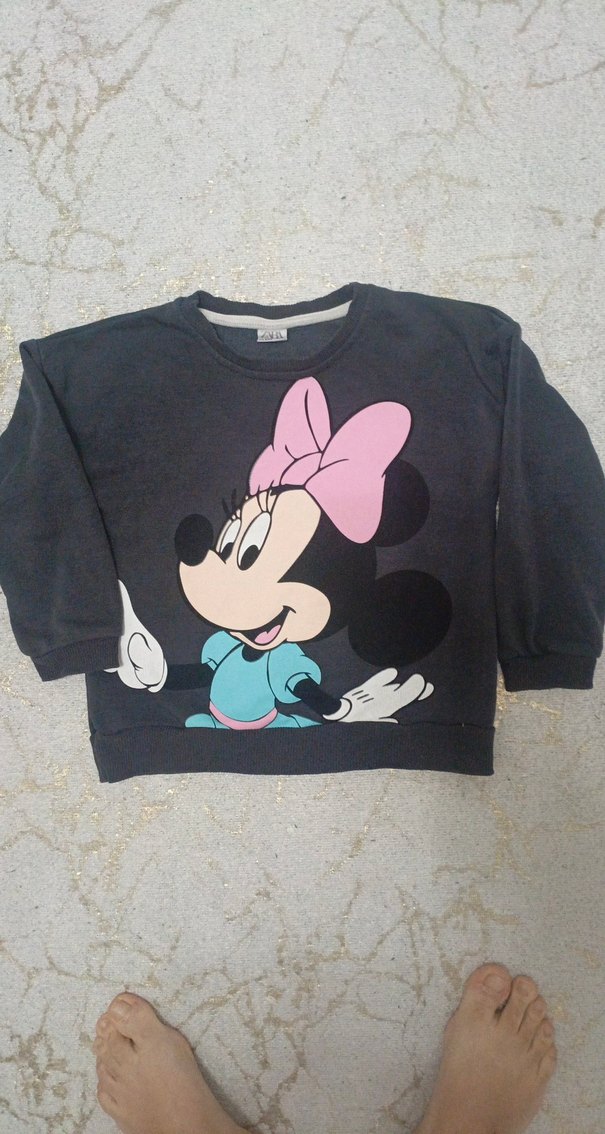 Kız çocukları için yumuşak kumaştan, bol kesim, uzun kollu, yuvarlak yakalı, koyu gri renginde, Minnie Mouse baskılı ve düğmeli sweatshirt.