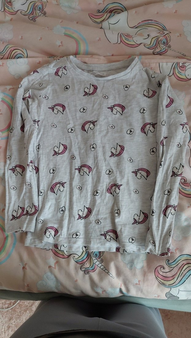 Kız çocukları için pamuklu, örme dokulu, gri uzun kollu tişört. Salaş kesim ve bisiklet yaka, küçük unicorn desenleriyle sokak stiline uygun.