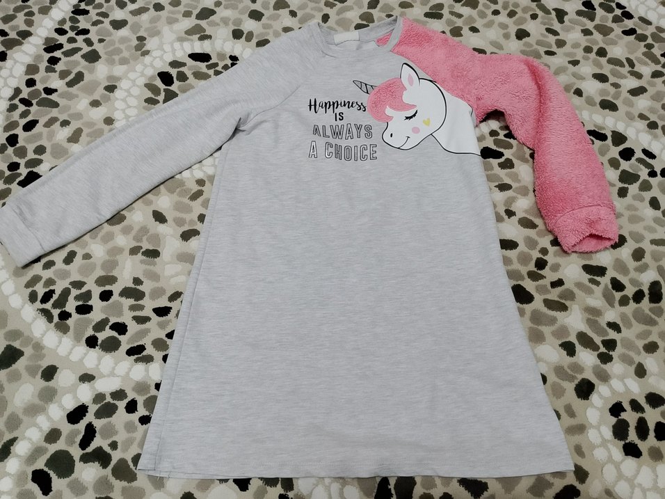 Gri renkli kız çocuk uzun kollu tişört, yuvarlak yaka ve baskılı unicorn desenli. Pamuklu, rahat kesim ve örme dokulu, trend günlük stil için uygun.