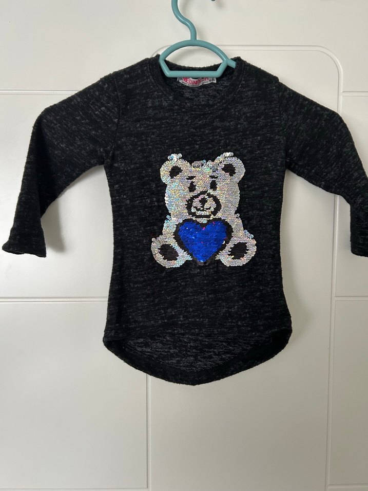 Gri renkli kız çocuk sweatshirt, uzun kollu ve yuvarlak yakalıdır. Yumuşak, sıcak kumaştan yapılmış olup, önünde renkli payetli ayıcıklı baskı bulunmaktadır. Rahat ve trend görünümlü. 4 yaş