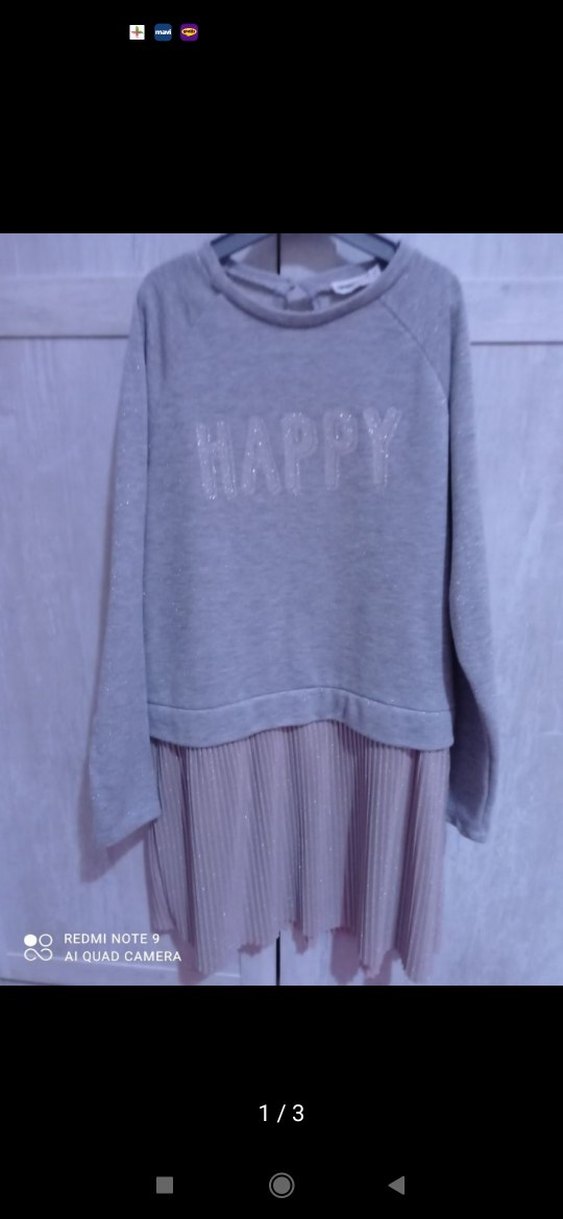 Gri renkli, uzun kollu, yuvarlak yakalı, bol kesim kız çocuk elbisesi. Önünde 'HAPPY' baskısı ve piliseli etek detayı bulunur. Trendy casual tarz için uygun.