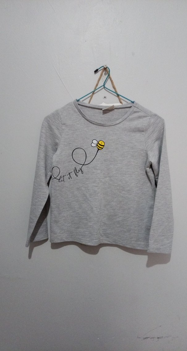 Pamuklu gri uzun kollu, yuvarlak yaka, bol kesim kız çocuk sweatshirtü. Arı baskısı ve düğme detayıyla rahat sokak stili için uygundur.