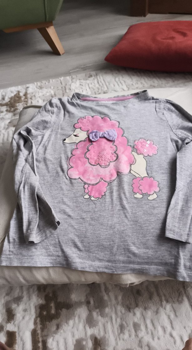 Gri renkli, uzun kollu kız çocuk tişörtü, bol kesim ve bisiklet yaka. Üzerinde kürk detaylı pembe pudel baskısı bulunur.