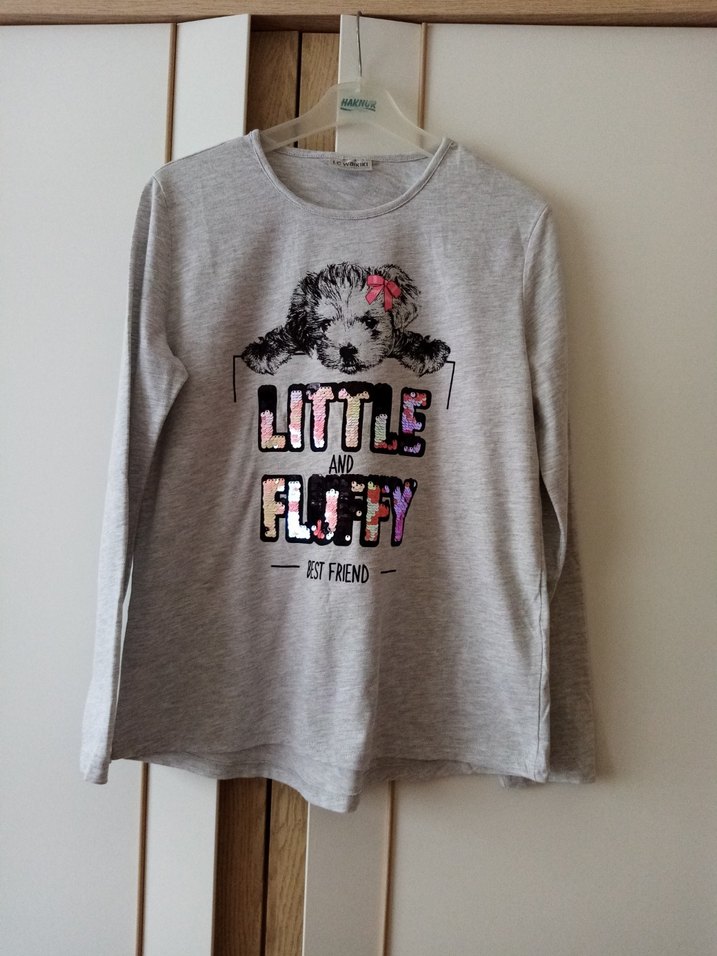 Gri renkte, uzun kollu ve bol kesim kız çocuk tişörtü. Dolabımda aynı yaşa uyumlu ürünler mevcut bakabilirsiniz ürün birleştirebilirim Üzerinde tüylü köpek baskısı ve "LITTLE AND FLOFFY BEST FRIEND" yazısı bulunur. Yumuşak ve sıcak kumaştan üretilmiştir.