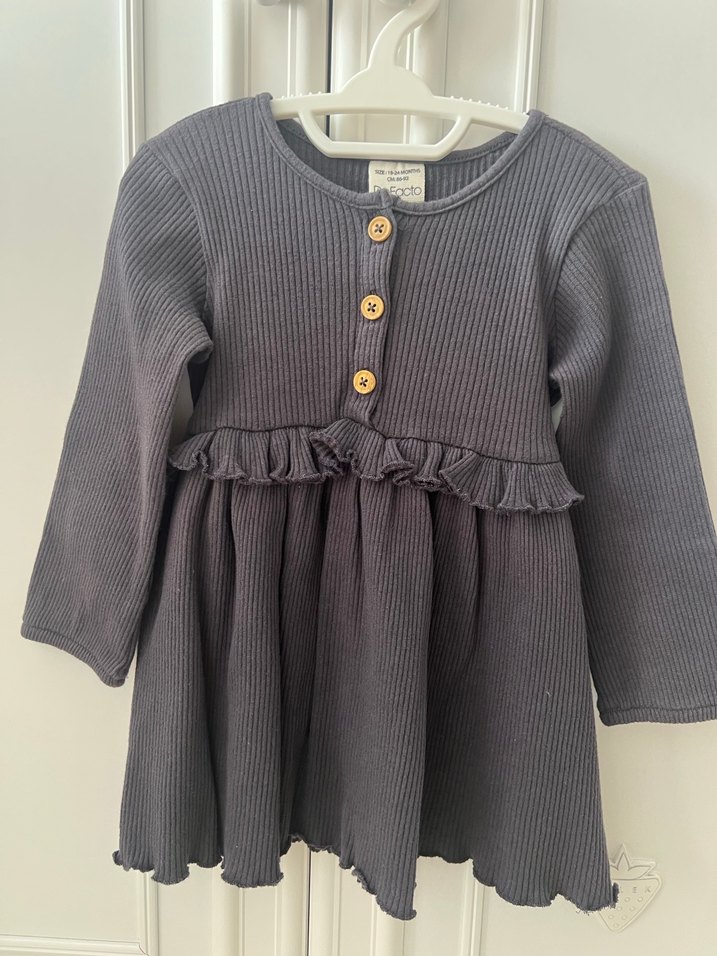18-24 ay. Uzun kollu, yuvarlak yaka ve beli fırfırlı gri triko kız çocuk elbisesi. Rahat ve salaş kesimle konfor sağlar.
