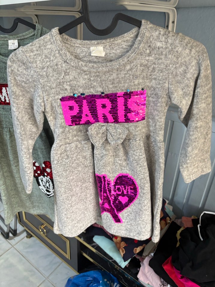 Gri renkli, uzun kollu, bol kesim ve yuvarlak yaka kız çocuk triko kazak. Yumuşak, sıcak örme kumaştan, üzerinde "PARIS" yazısı ve kalp desenleri bulunur.