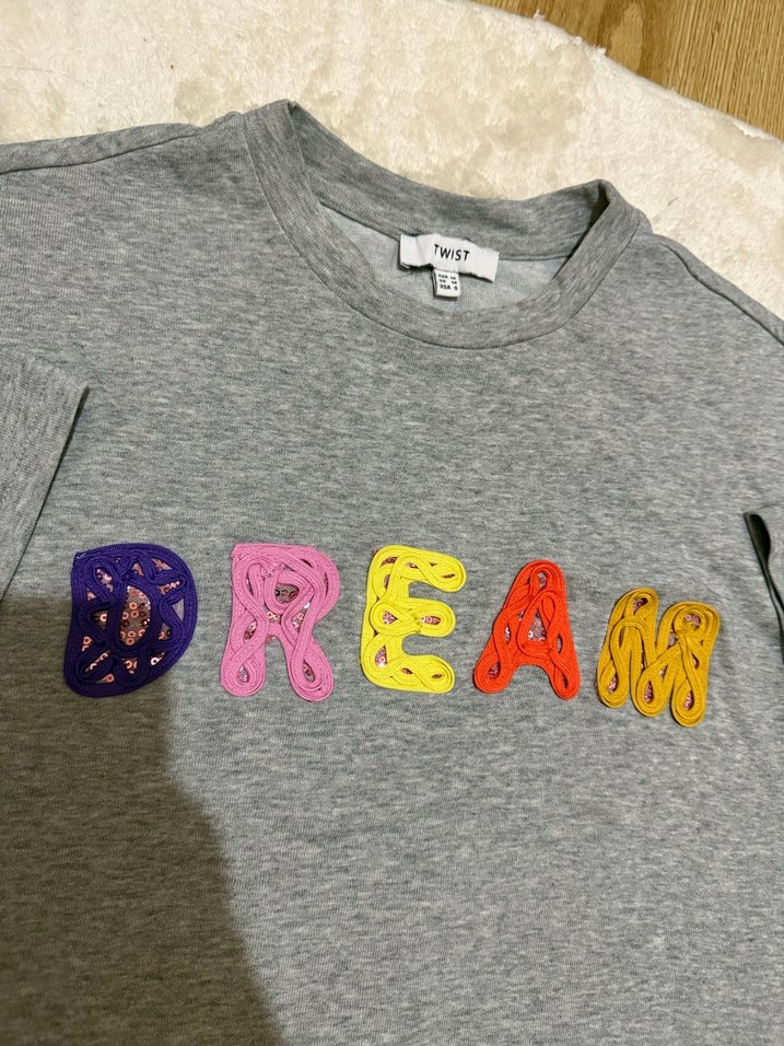Kız çocuk gri uzun kollu triko tişört, loose fit kesimlidir. Yuvarlak yaka ve önünde renkli "DREAM" baskılı harfler bulunur. Trendy casual tarzda.
