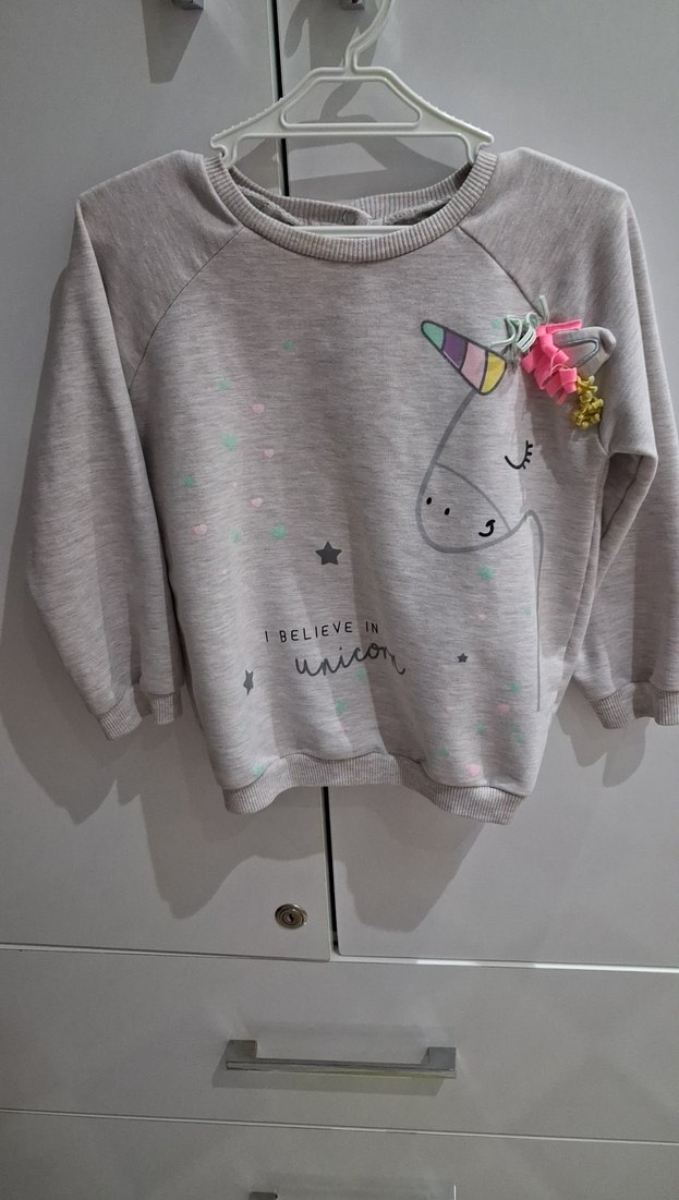 Gri renkli, uzun kollu, yuvarlak yakalı ve bol kesim kız çocuk sweatshirtü. Yumuşak ve sıcak kumaştan örülmüş, renkli unicorn baskısı bulunur. Sokak modasına uygun.
